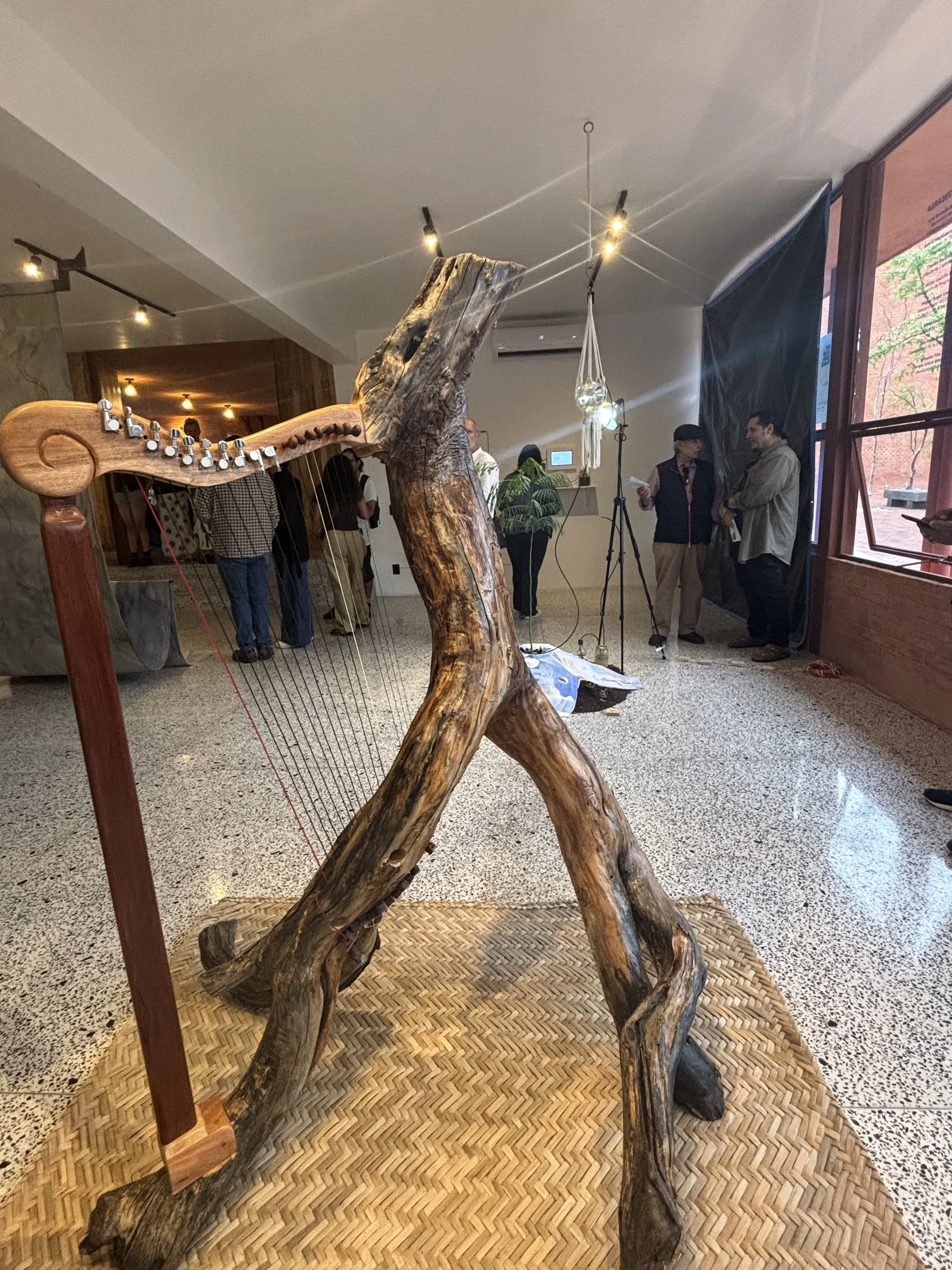 A harp stands as a masterful fusion of nature and artistry, meticulously crafted from a solid tree trunk. Its body retains the organic curves and natural grain of the wood, subtly polished to reveal the warm, rich tones hidden within. The texture is both raw and refined, a testament to the respect for the material’s innate beauty. Strings stretch elegantly across the frame, their tension balanced to produce a clear, resonant sound that echoes the timeless myths evoked by its name. Orfeo is not merely an instrument but a living sculpture—an embodiment of tradition, strength, and poetic resonance carved directly from Mezqute wood found in the Ribera of Chapala .